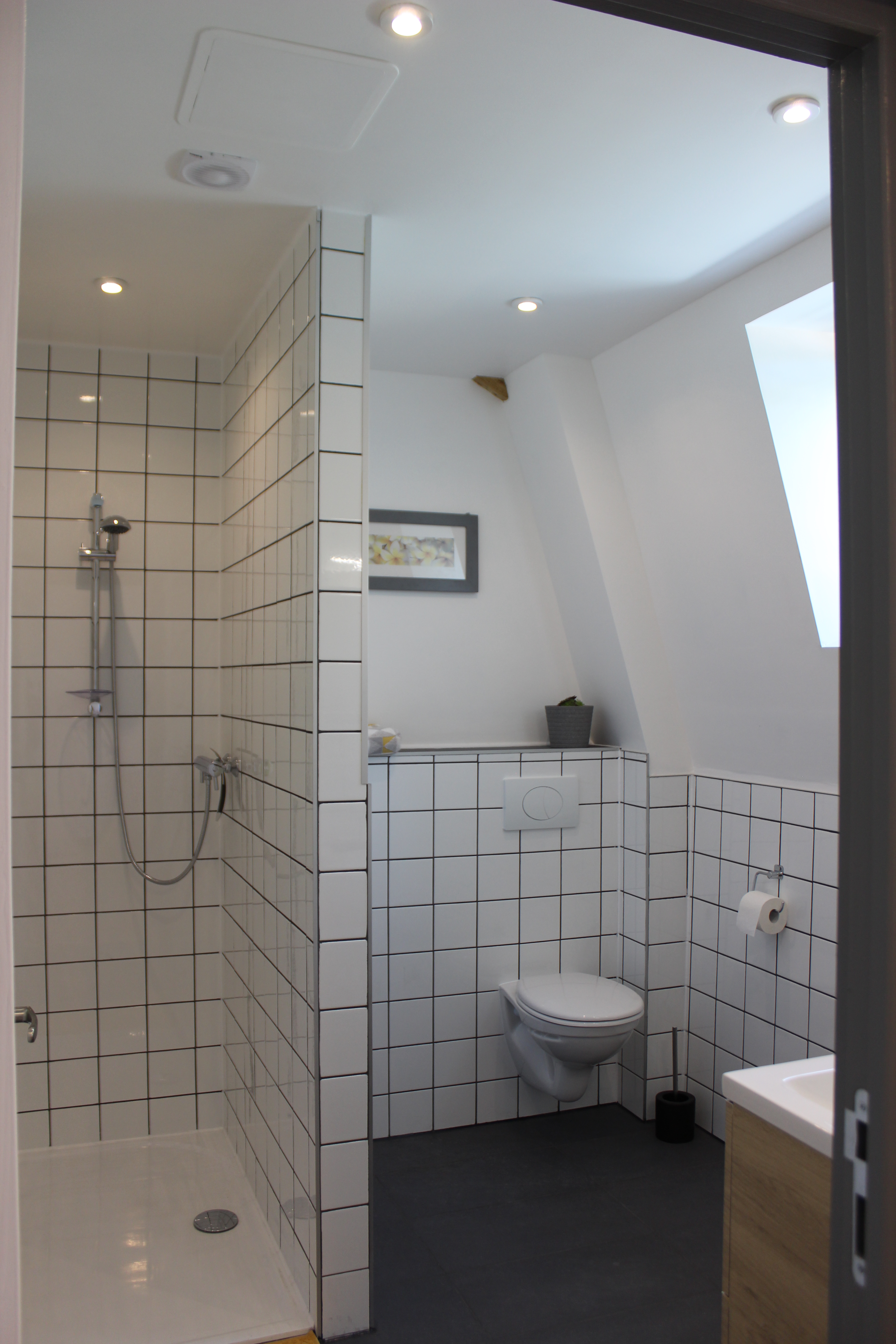 bathroom with a walk-in shower, basin and toilet